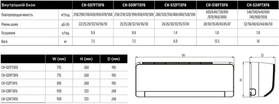 Блок CH-S07FTXF6(I) призначений для обслуговування приміщень площею 20 м².