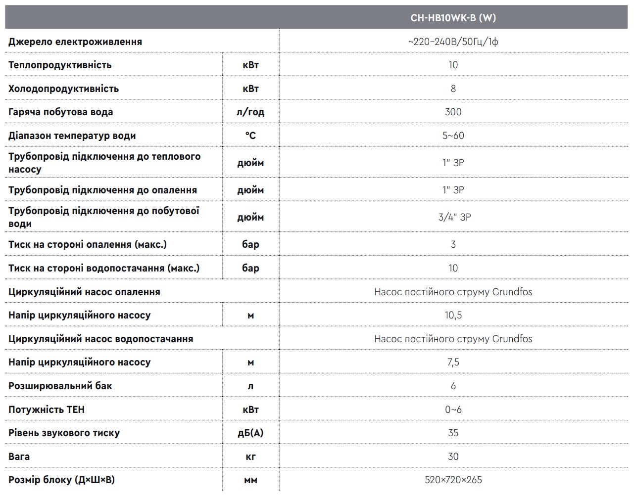 Cooper&Hunter CH-HB10WM-W це трифазний гідромодуль розроблений для інтеграції теплових насосів повітря–вода у сучасні кліматичні системи.